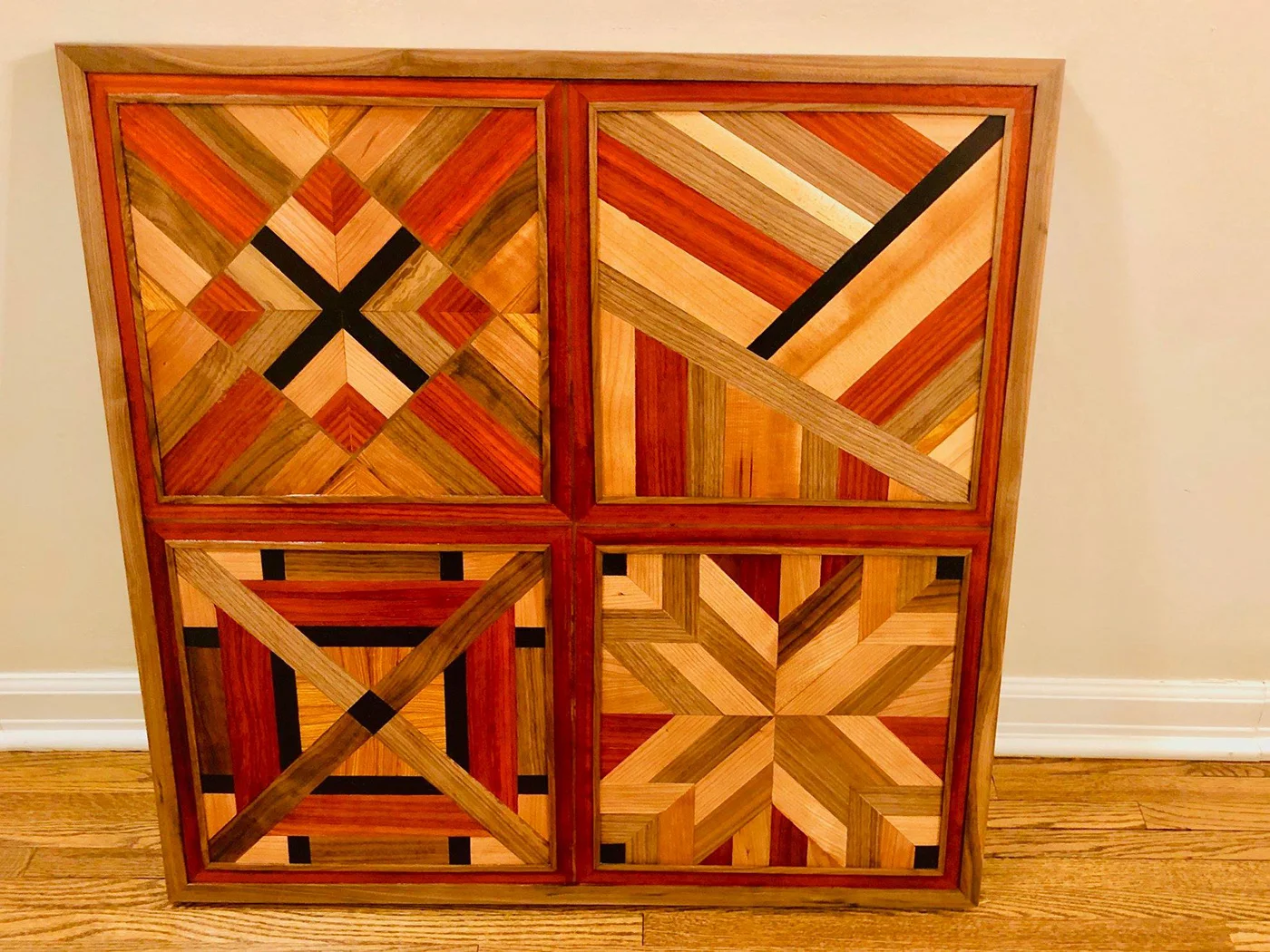 Wall hanging of mixed scrap wood including padauk, walnut, canary wood, cherry, wenge, and alder